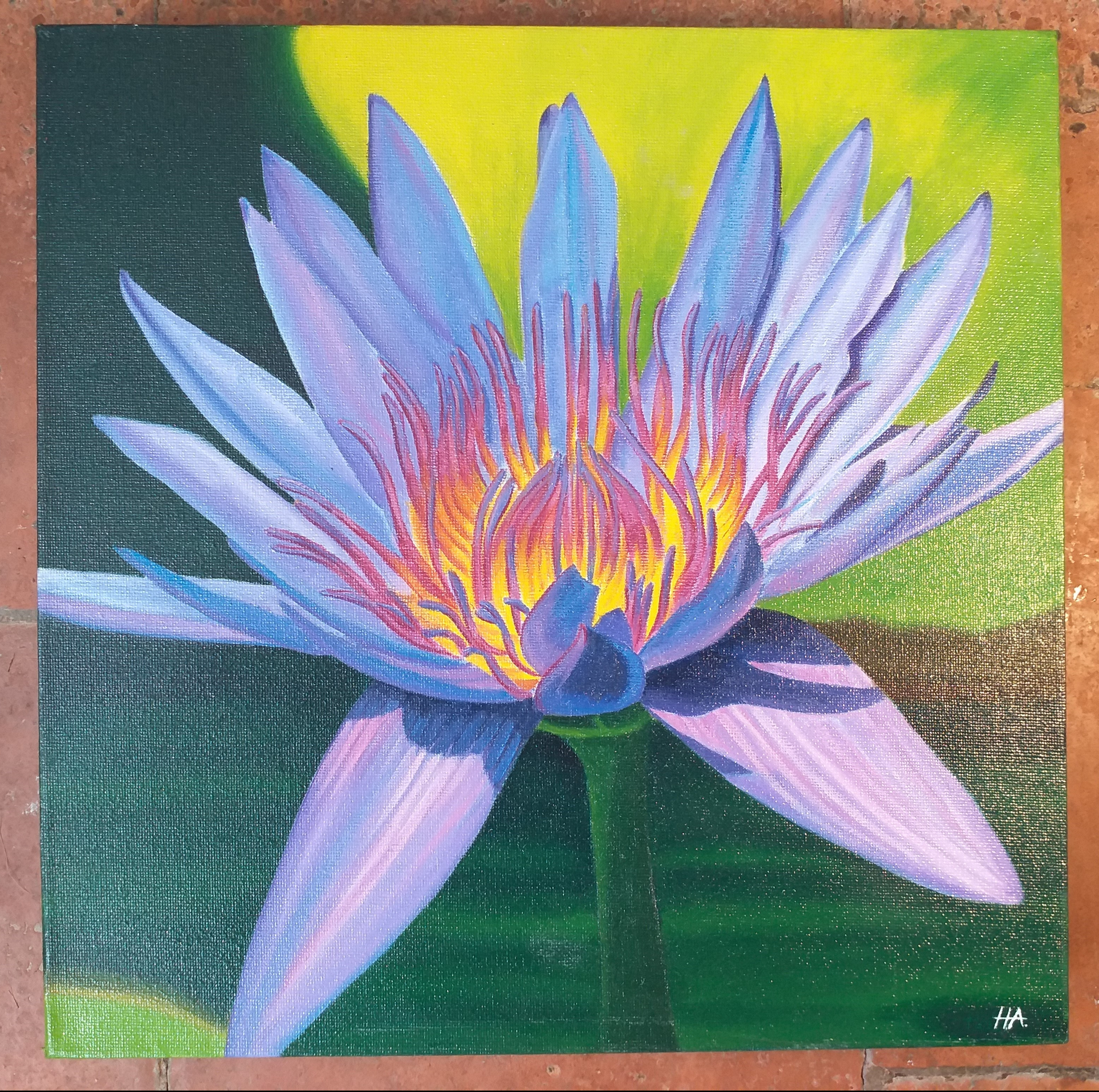 New arrivals this morning, four very colourful oils on canvasses and one acrylic on canvas by artist Helen Absalom. Purple Water lily, Purple Pansy, White Pansy, Hydrangea and ‘Brittany Bees‘.