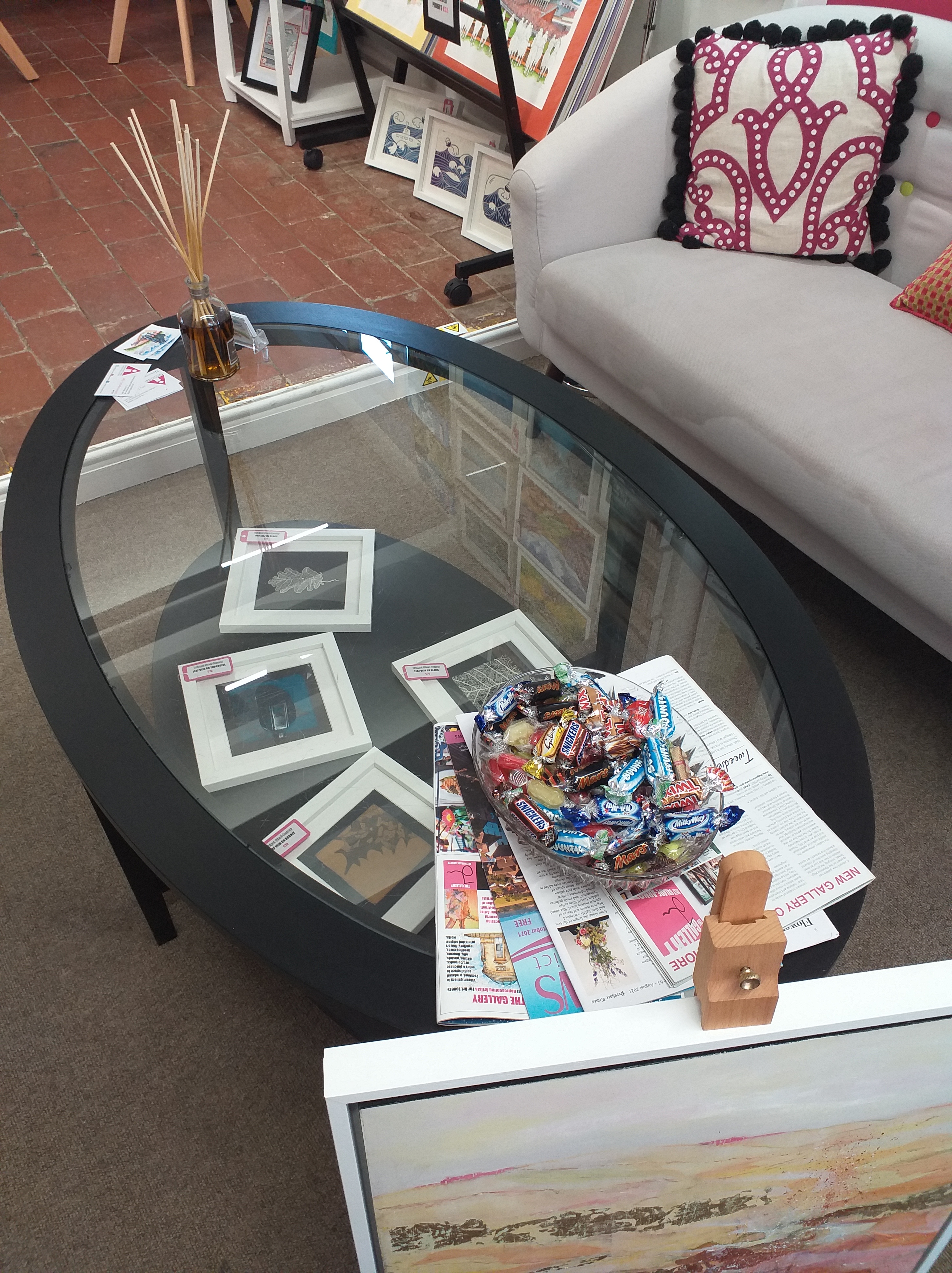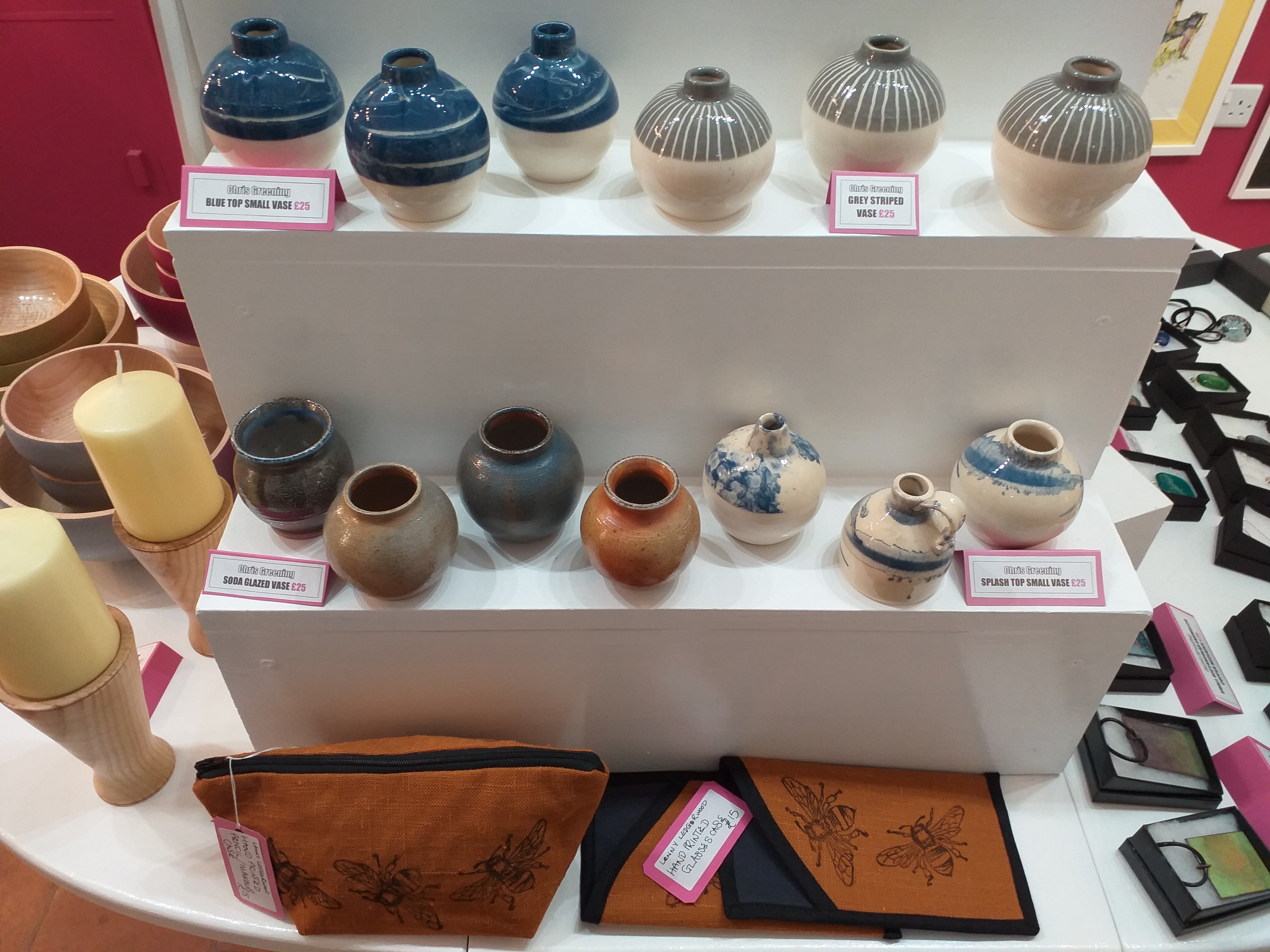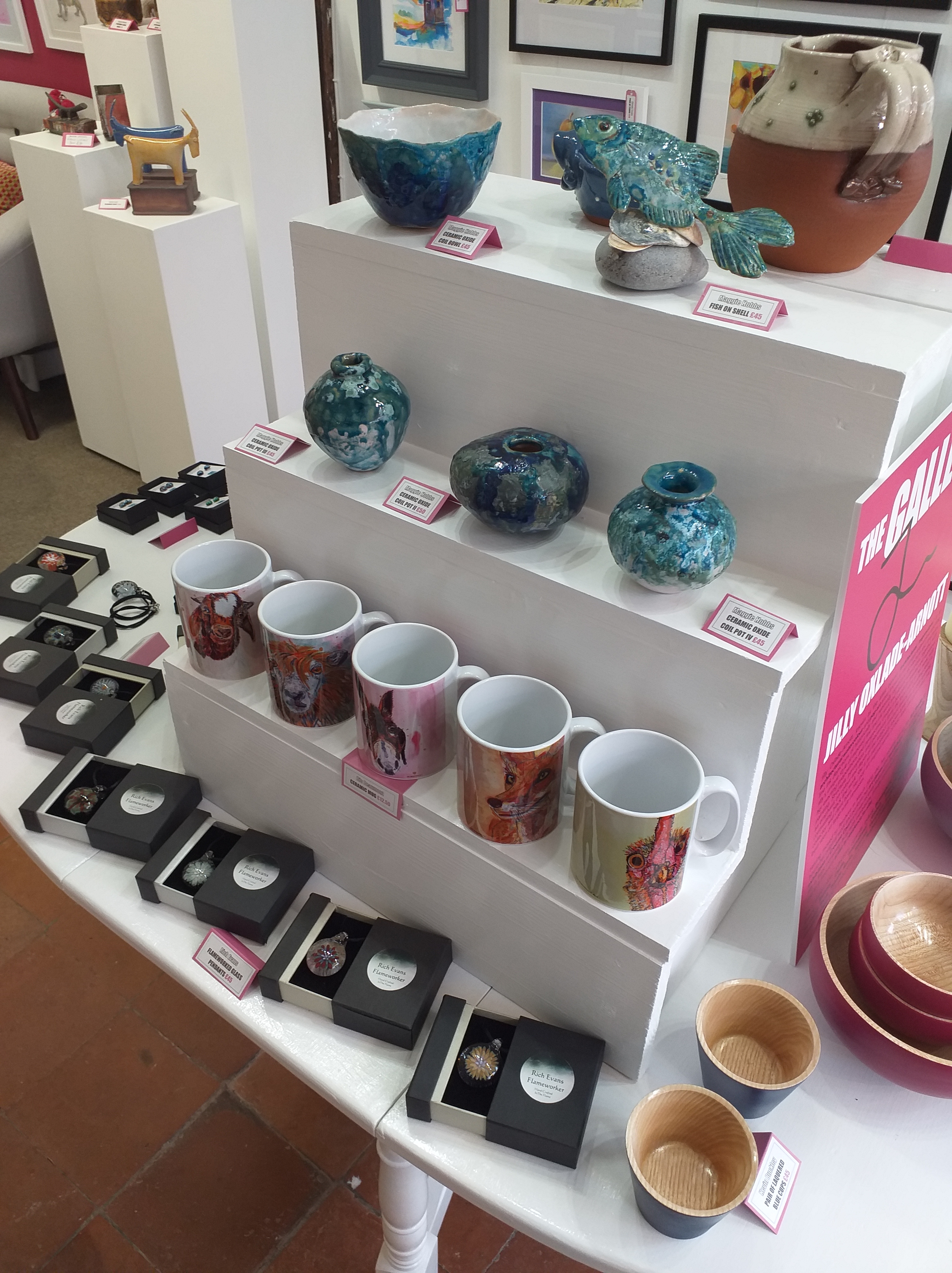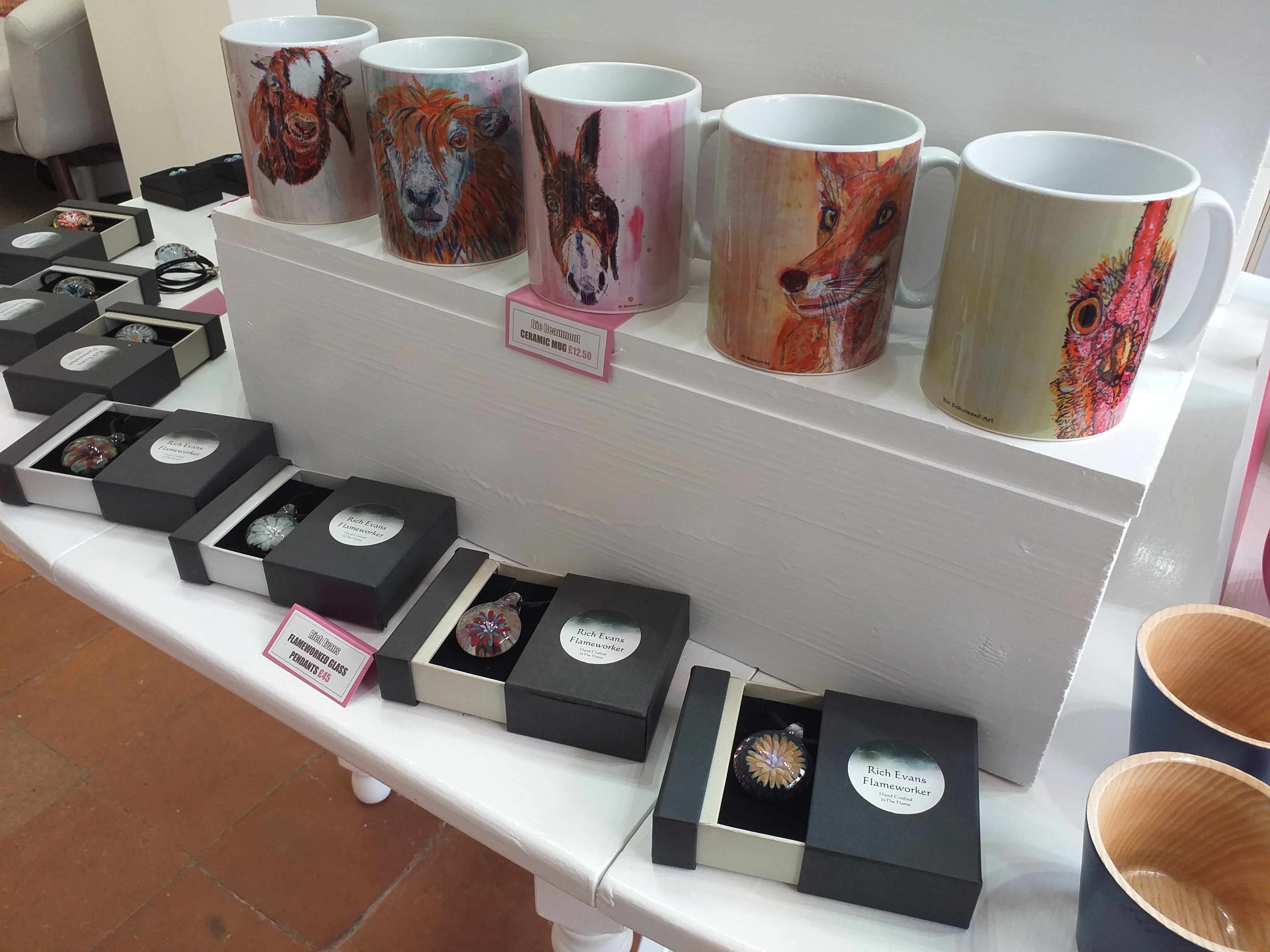 The entrance table now displays more of the ever popular fused glass earrings, pendants, cufflinks and unique frame worked pendants. Plus animal print mugs, original gouache blocks, hand crafted wooded bowls, candle stands and cups, ceramics and lots of amazing pottery. – perfect gifts.