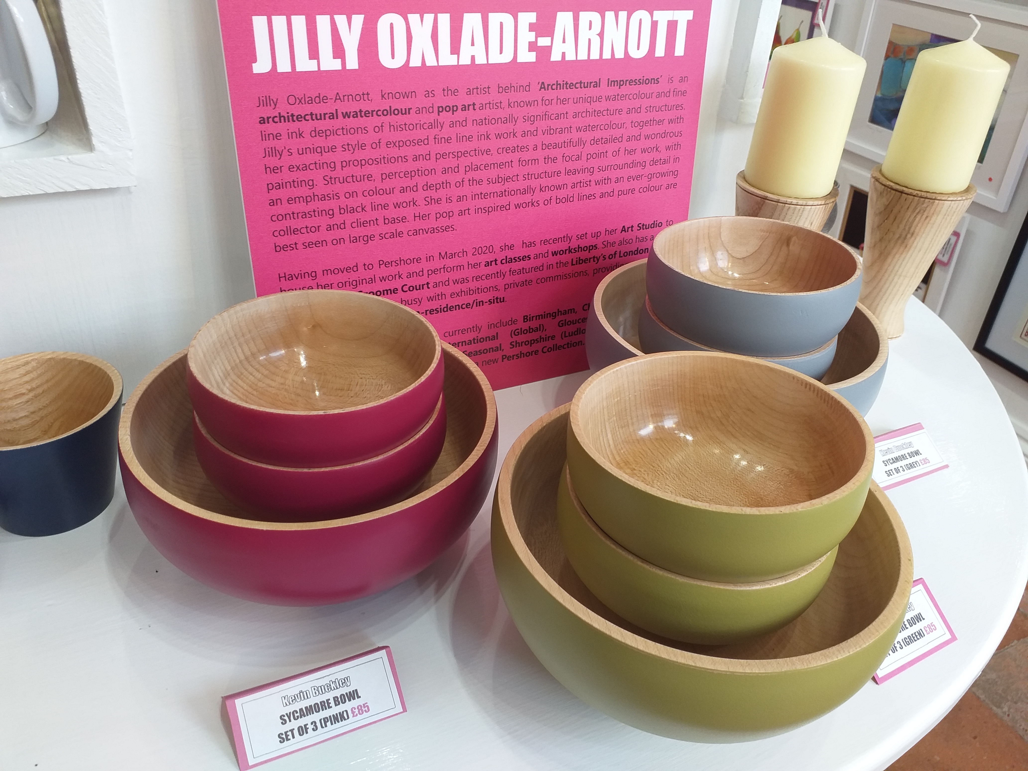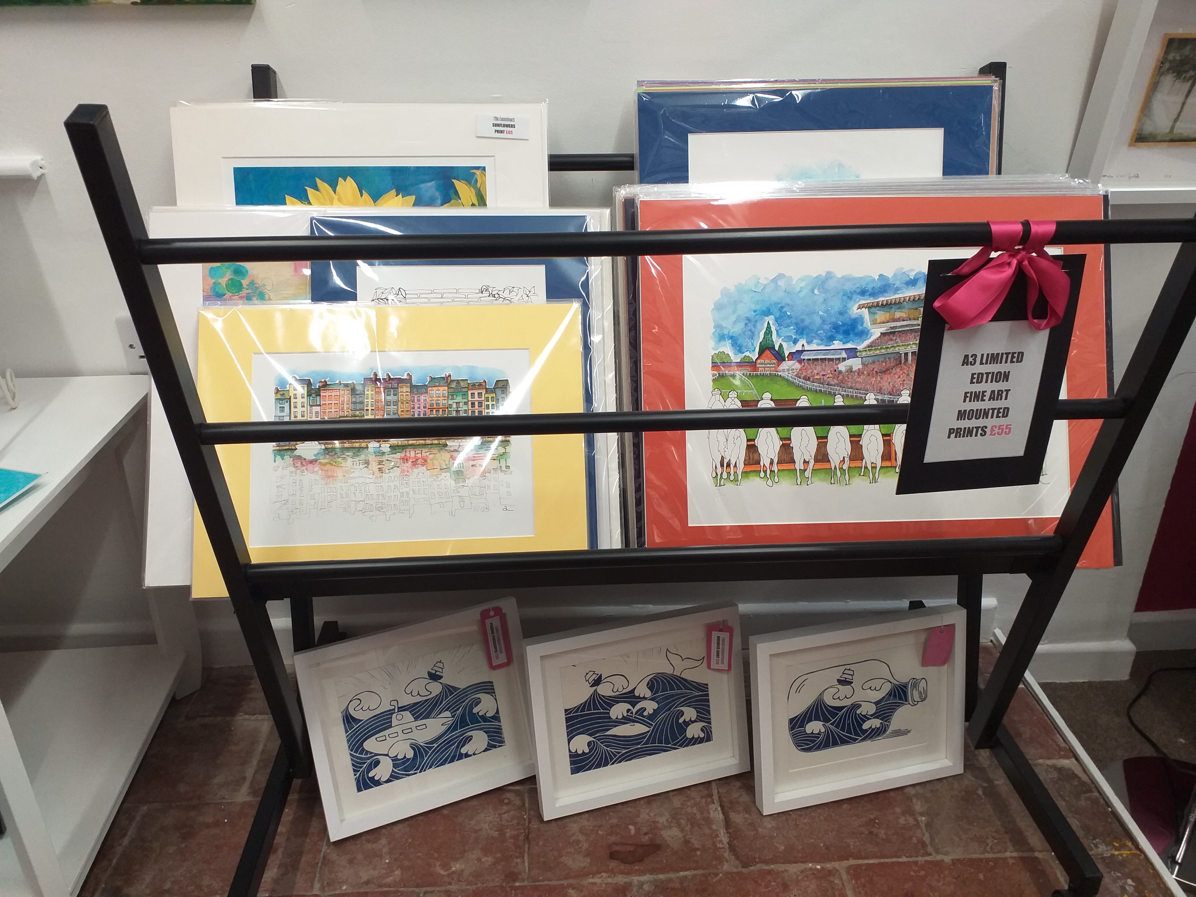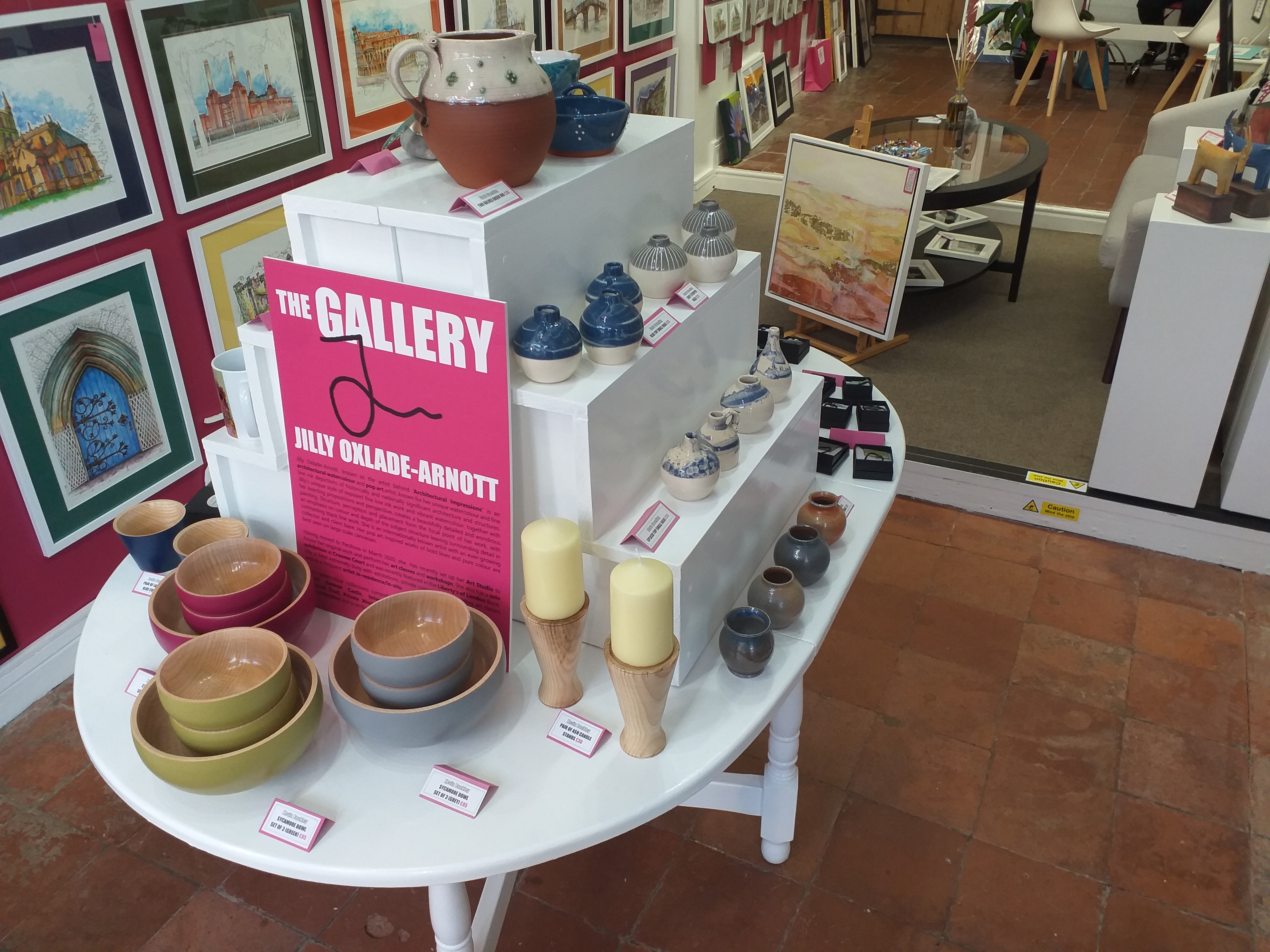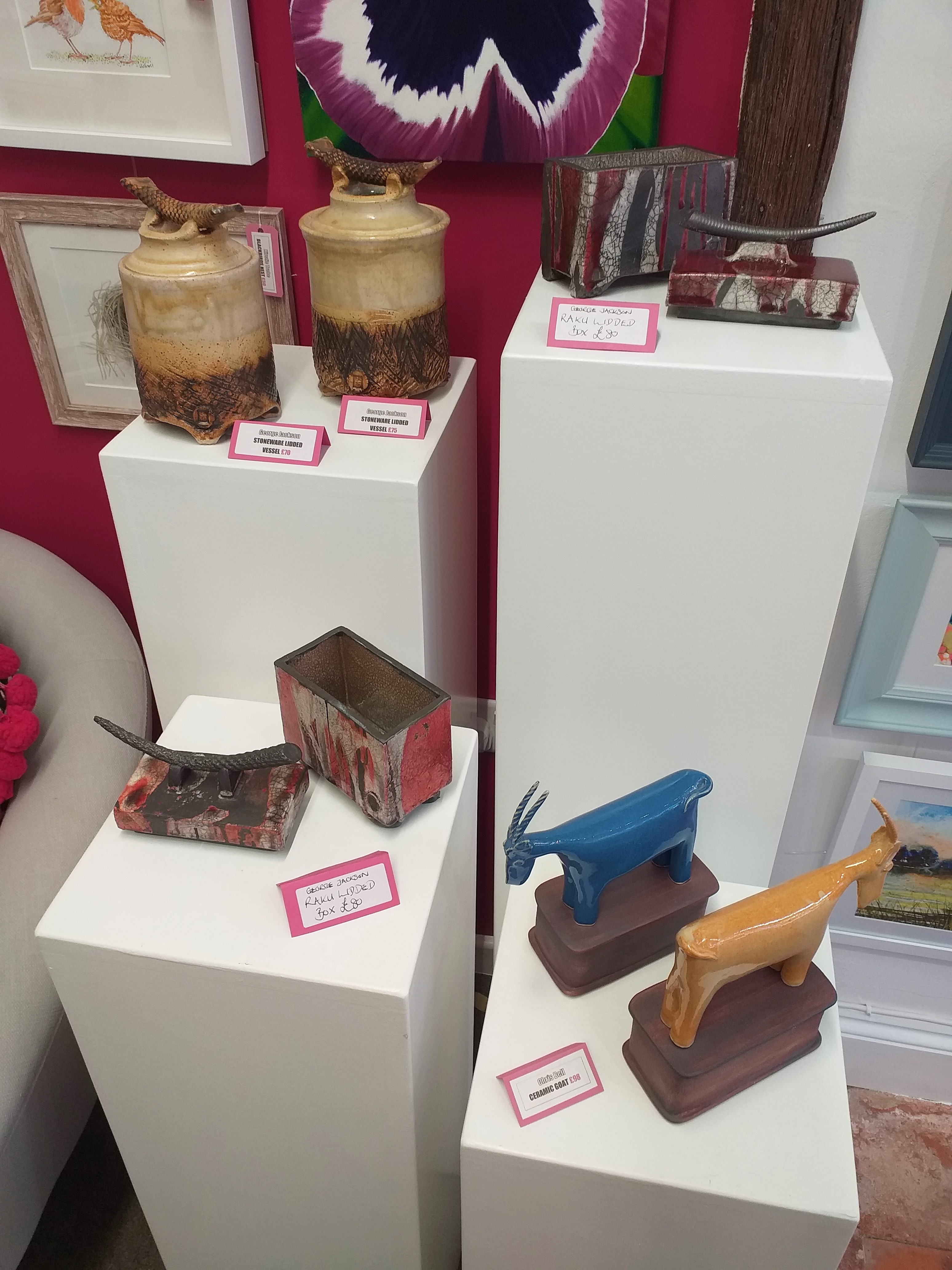 The entrance table now displays more of the ever popular fused glass earrings, pendants, cufflinks and unique frame worked pendants. Plus animal print mugs, original gouache blocks, hand crafted wooded bowls, candle stands and cups, ceramics and lots of amazing pottery. – perfect gifts.