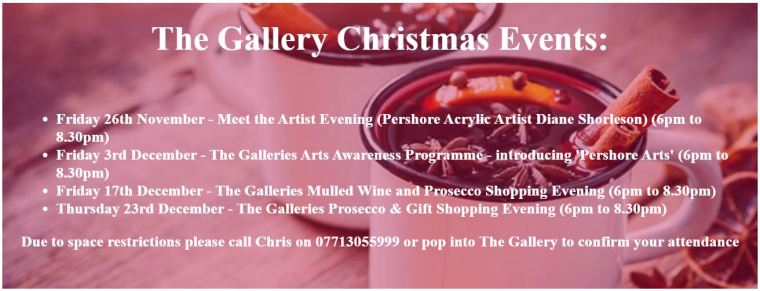 The Gallery will be hosting a number of Late Night Events before Christmas (See posts for more details) and is open on Sundays throughout November and December.