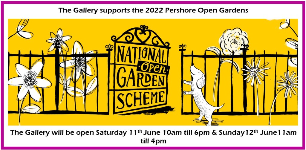 The Gallery is pleased to announce that it’ll be open on Sunday 12th June from 11am till 4pm in support of the 2022 Pershore Open Gardens. This is in addition to its normal Saturday 10am till 6pm hours.