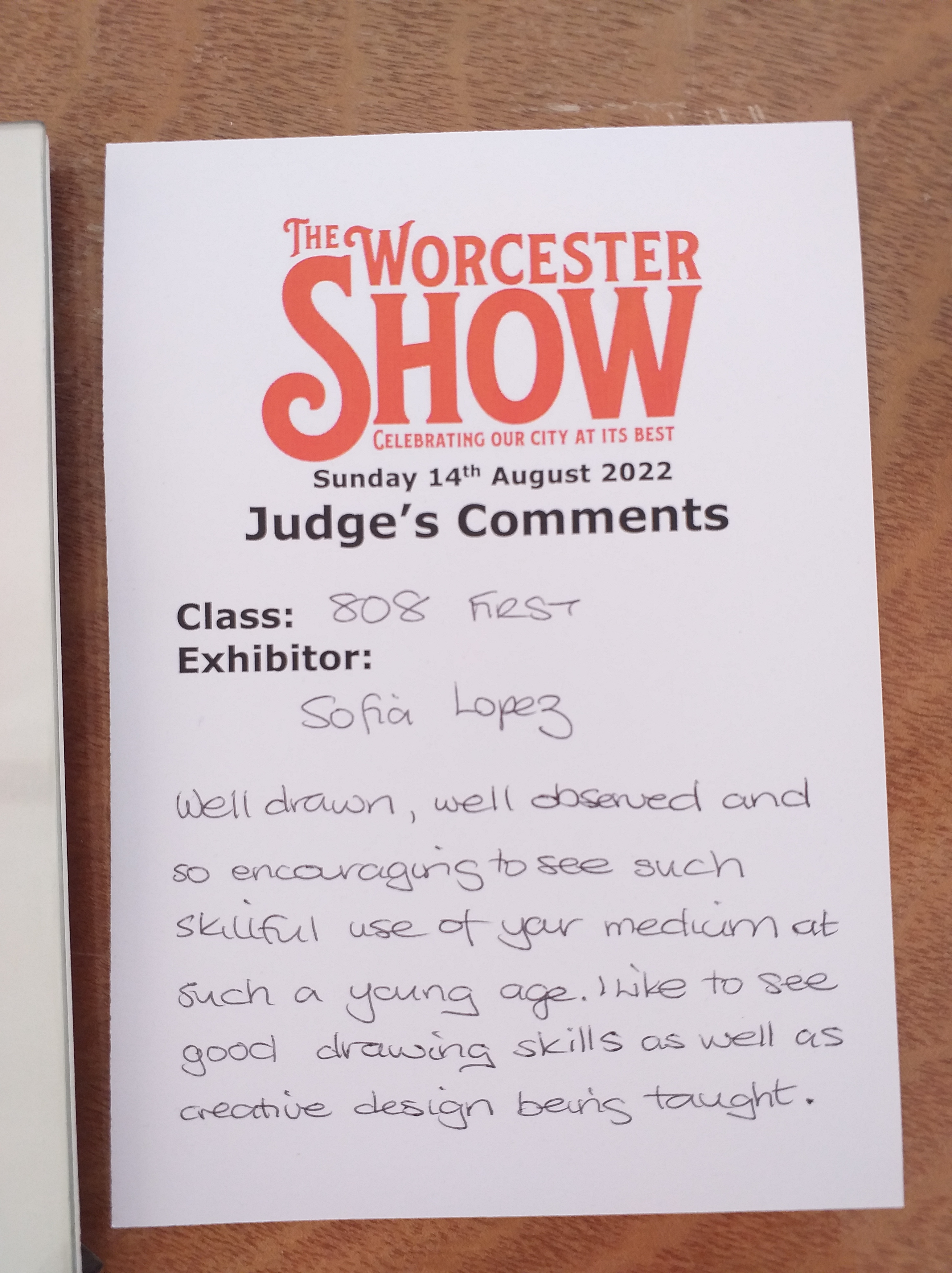 Judges Comments: Well drawn, well observed and so encouraging to see such skilful use of your medium at such a young age. I like to see good drawing skills as well as creative design being taught.