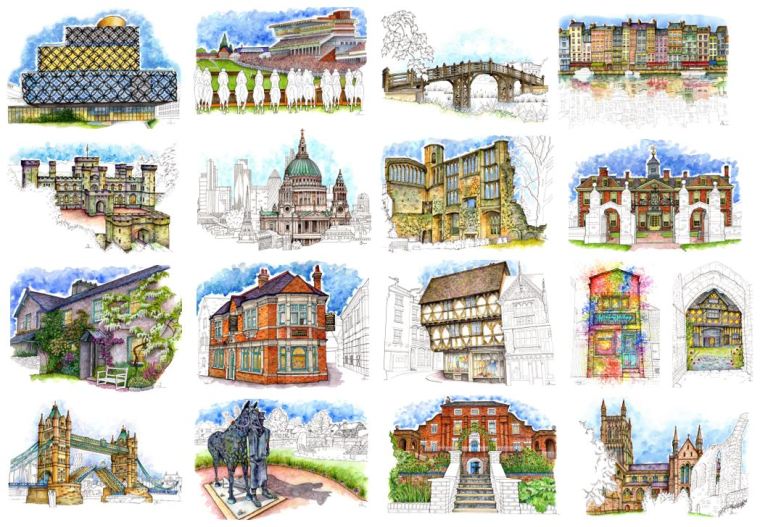 Architectural Fine Line Ink and Watercolour by Jilly Oxlade-Arnott, now available as framed or mounted limited edition fine art prints.